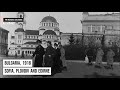 Wounded soldiers at a Russian Red Cross field hospital near Lozengrad (Kırklareli). Tsar Ferdinand and Tsaritsa Eleonora arrive at the Odrin (Edirne) train station. Together with high ranking army men, they visit the "Sultan Selim" mosque. Cavalry, infantry, captured enemy soldiers.